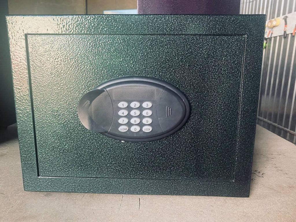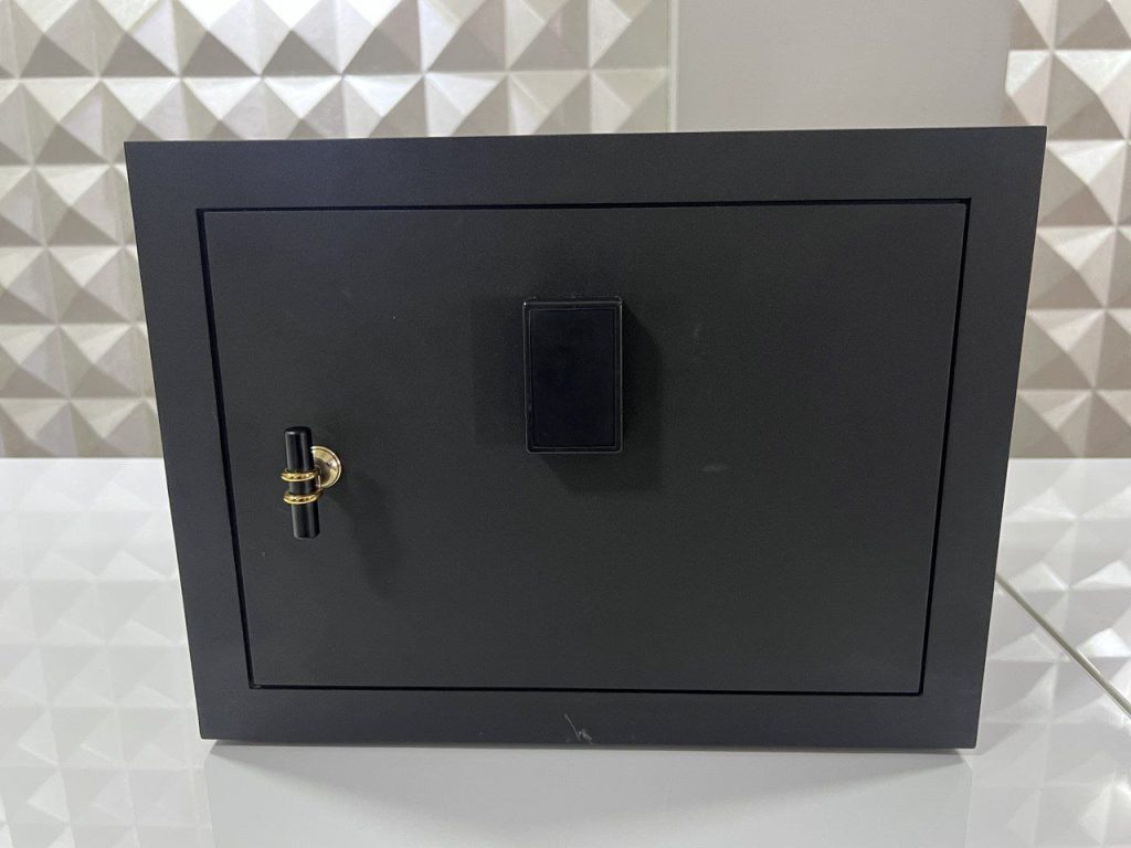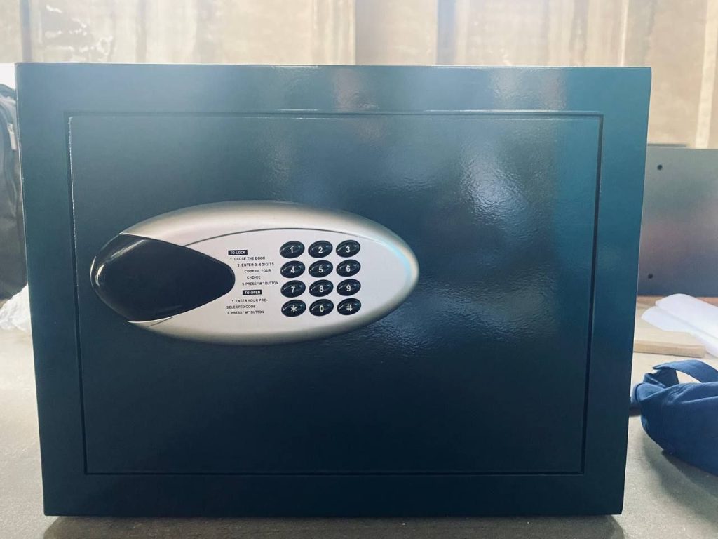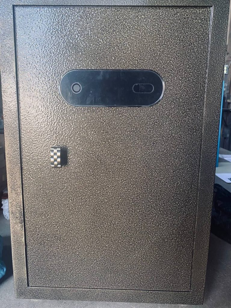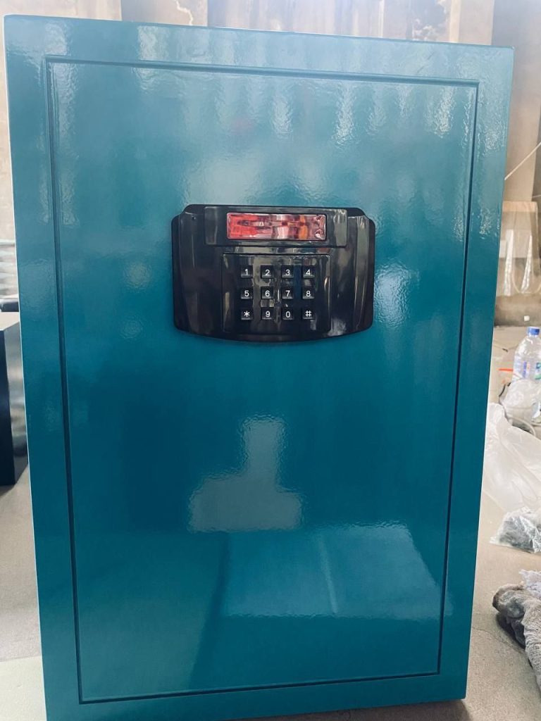Открывается с помощью 6 значного кода и отпечатка пальца.